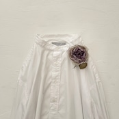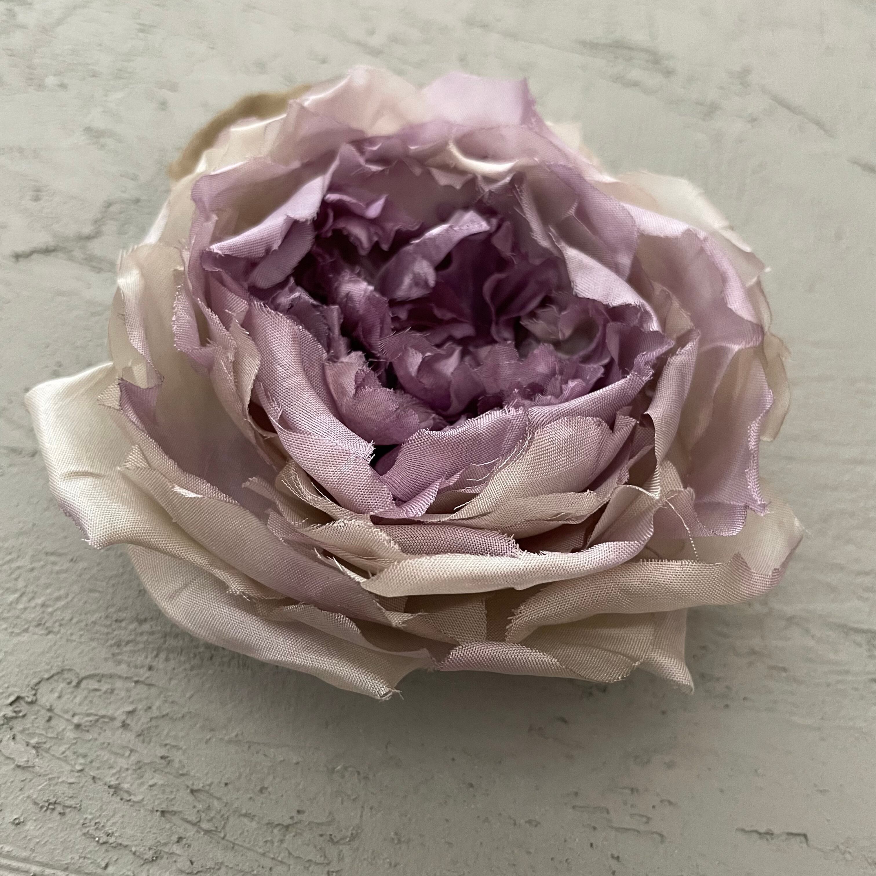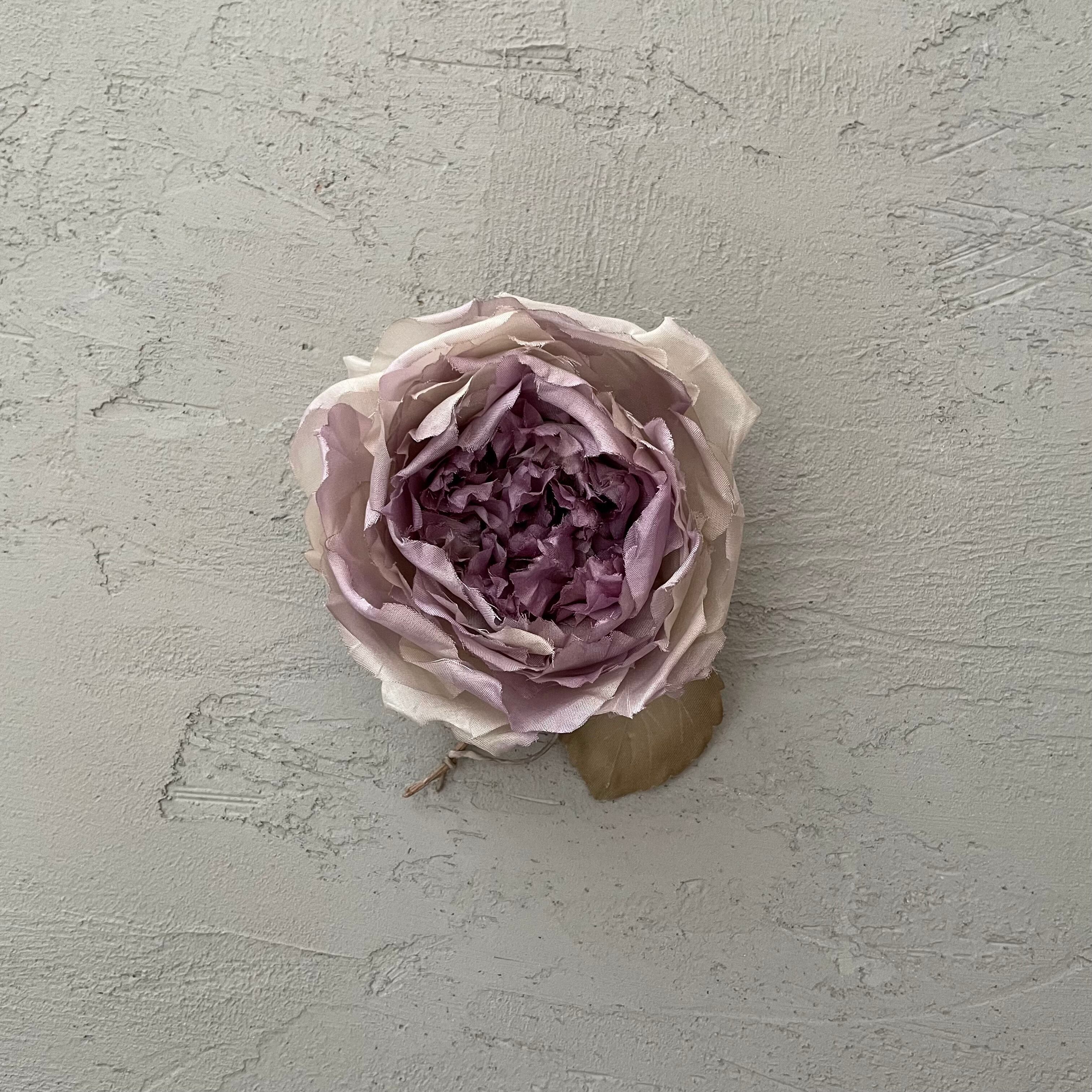 Grayish purpleのロゼット薔薇を絹で制作したコサージュです。花の中心に向かって紫が強くなります。存在感のある大きさ。