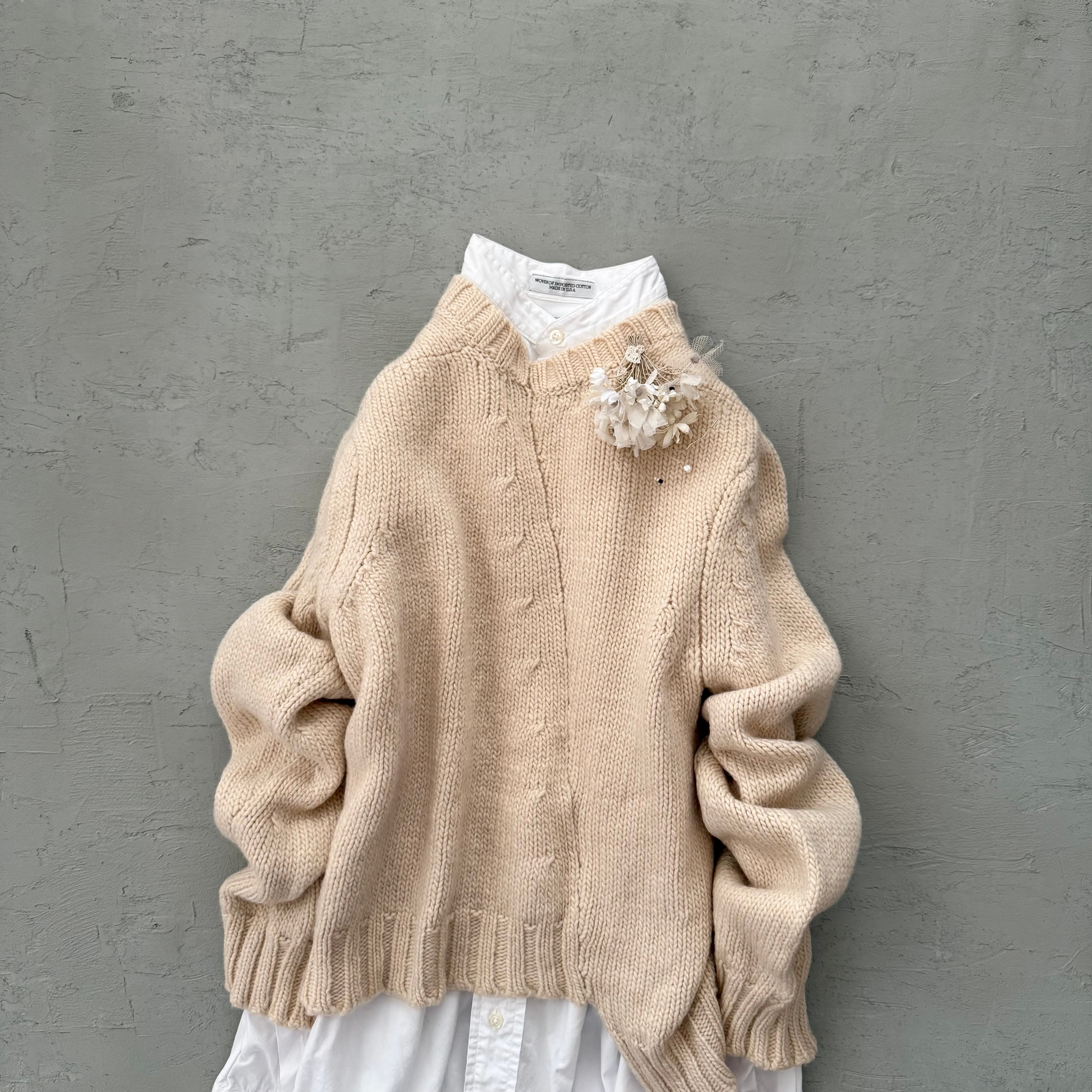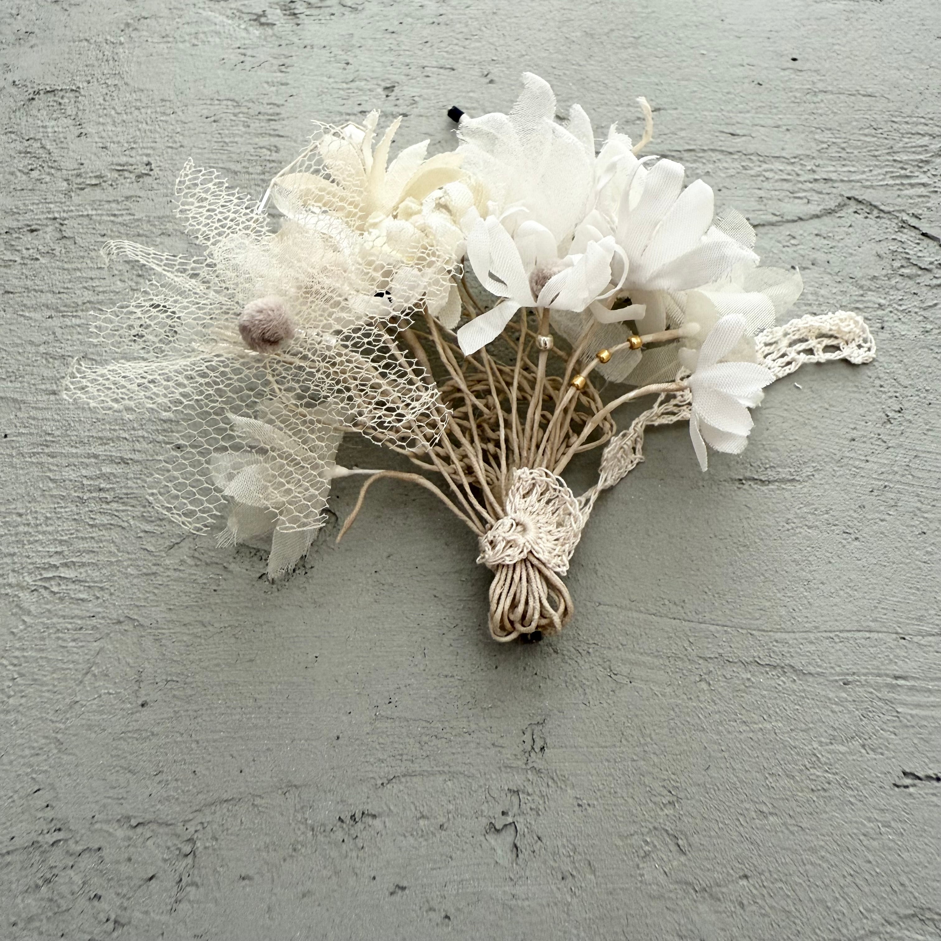 ひらりと揺れる手編みレースが軽やかなリズムを添え、ふわり柔らかな印象のコサージュです。