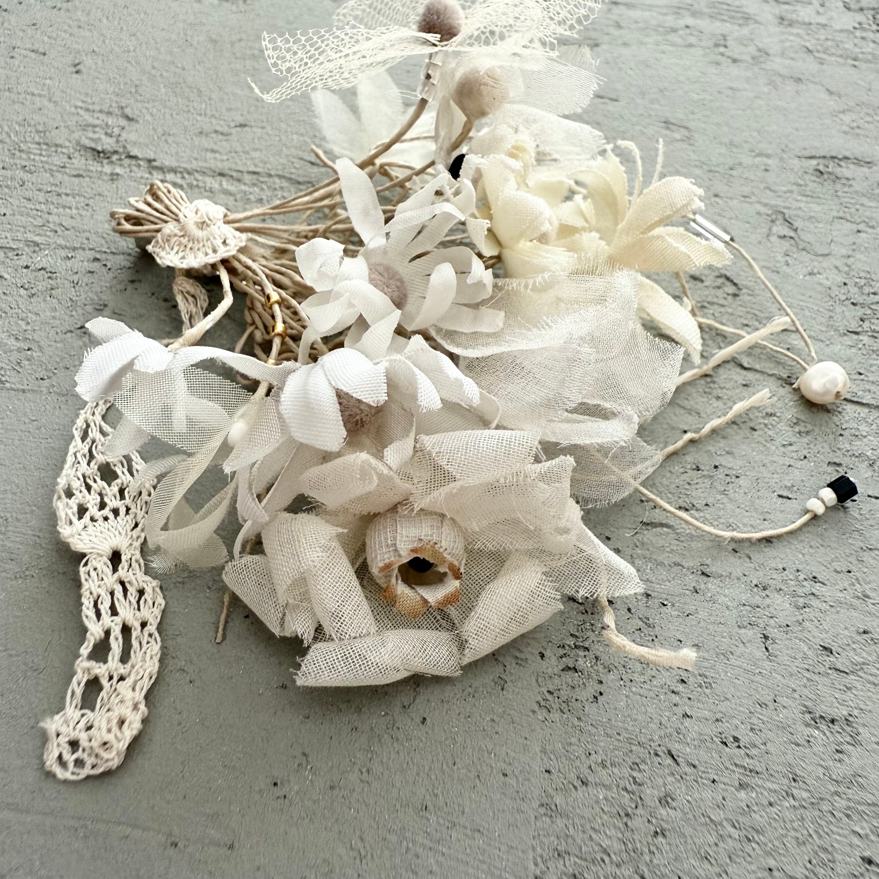 白に染められた花々が『 fuwari 』重なり合い、優しく輝くビーズがそっと彩ります。