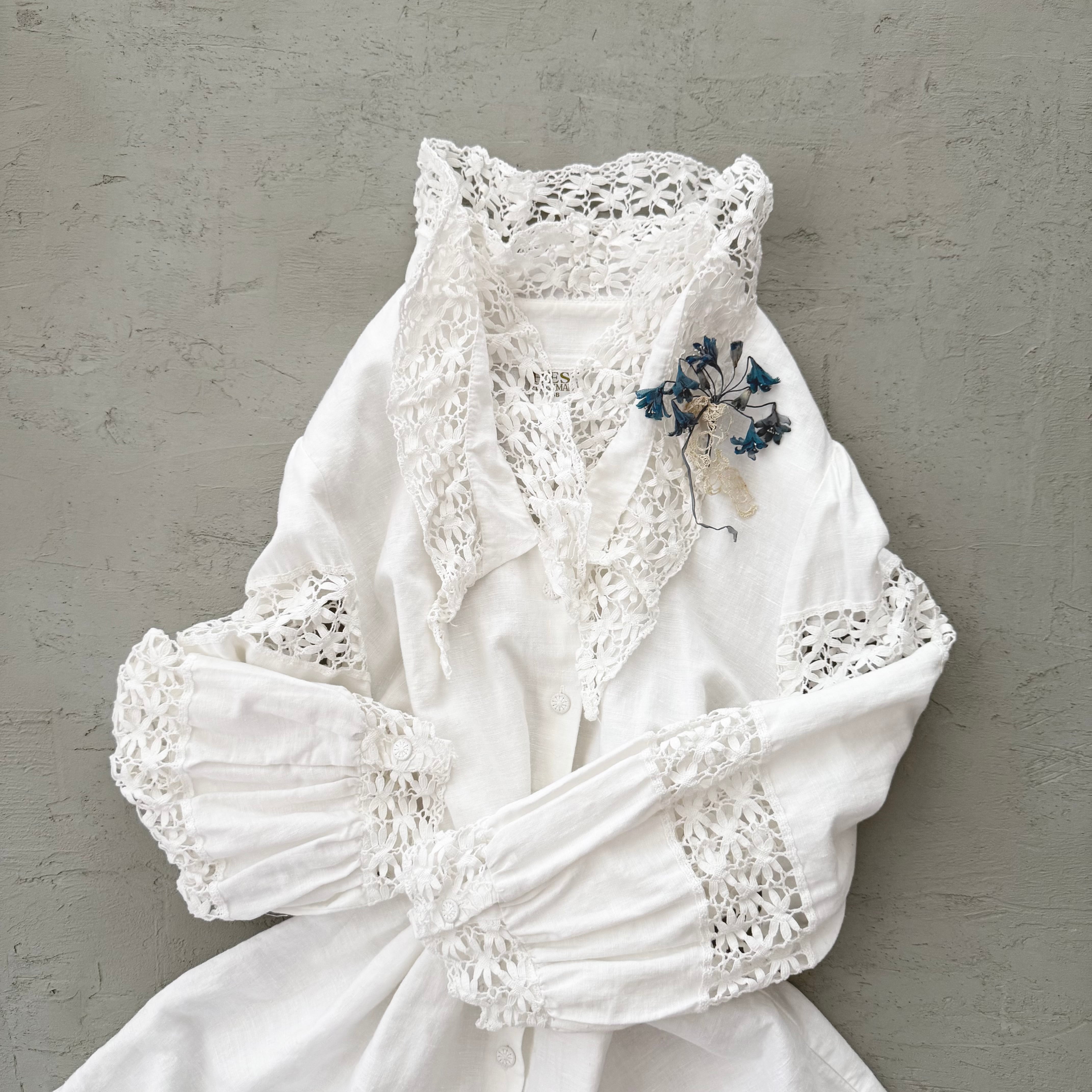 ランダムに編まれた手編みレースも同じ色に染め、年月を纏ったような趣きを添えて。