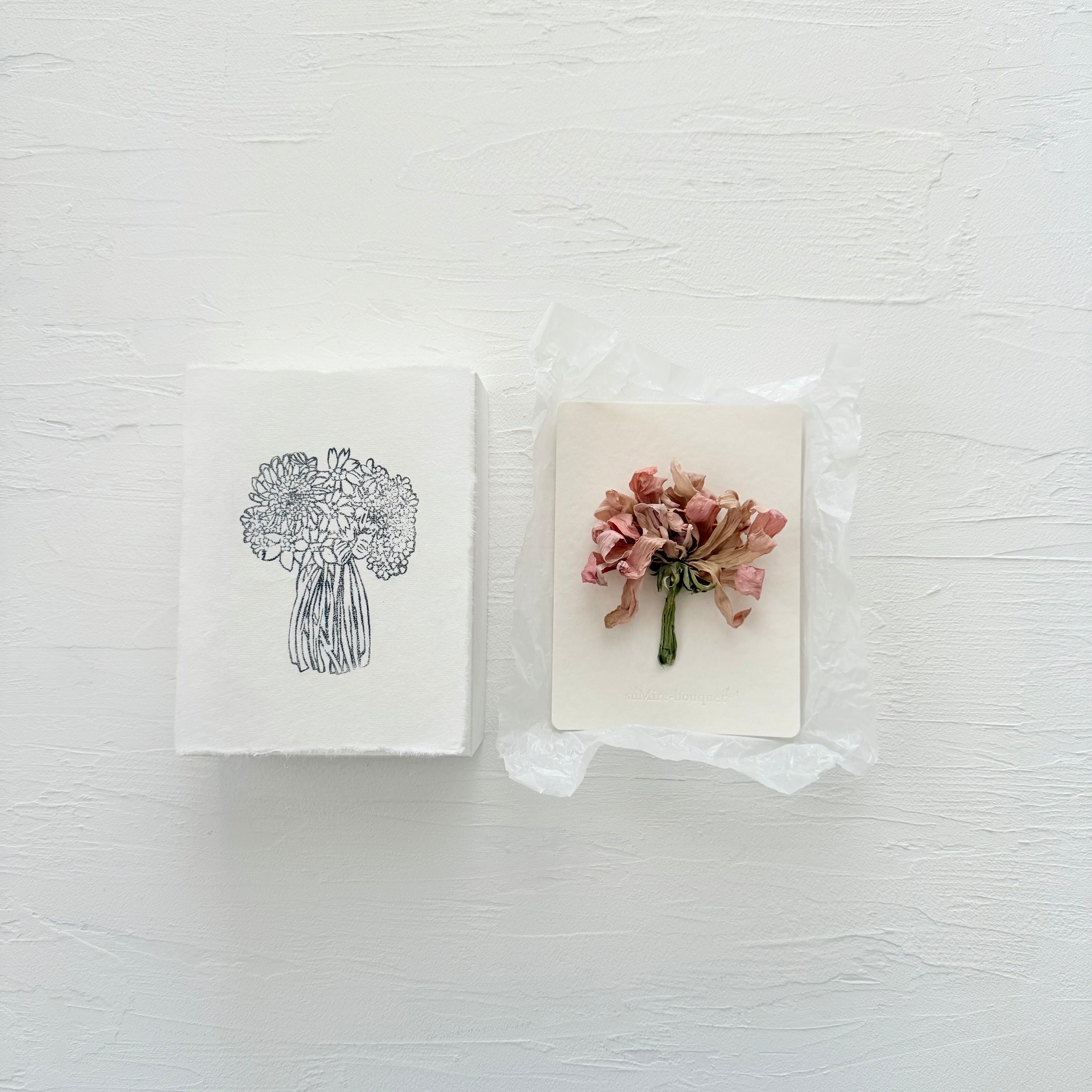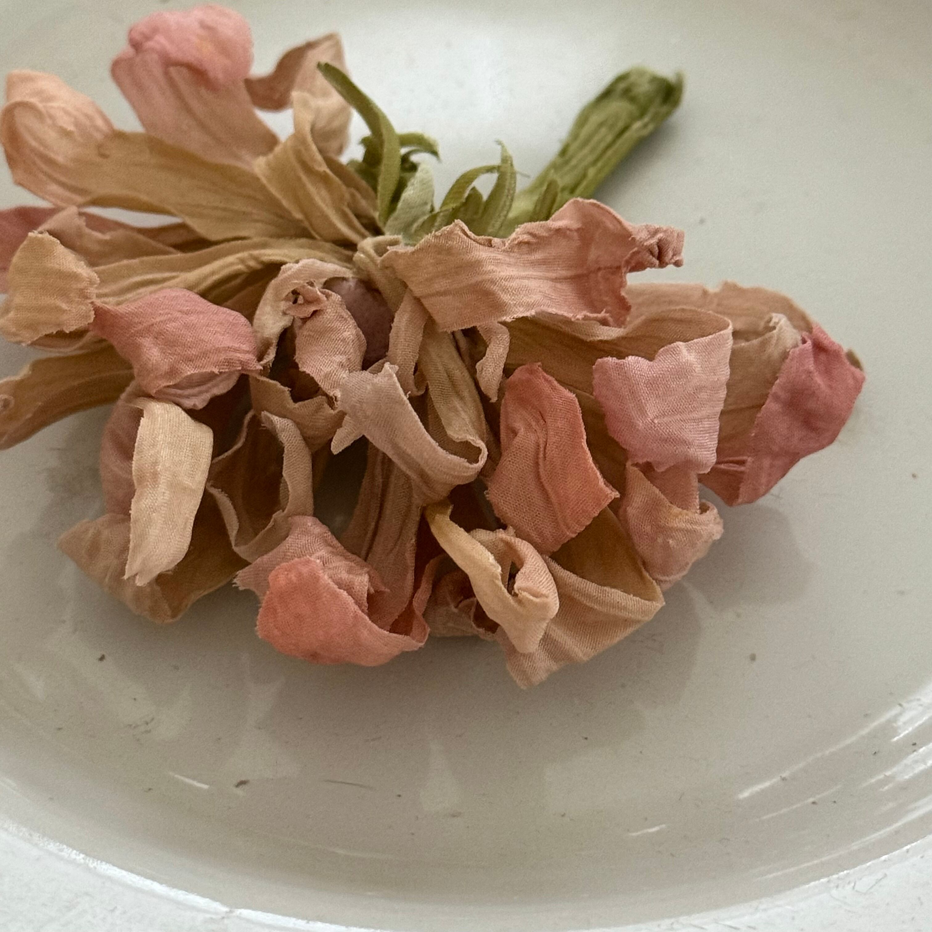 ドライフラワーのピンクマムをモチーフに、からからに乾いた花びらの表情をそのまま閉じ込めたコサージュ。